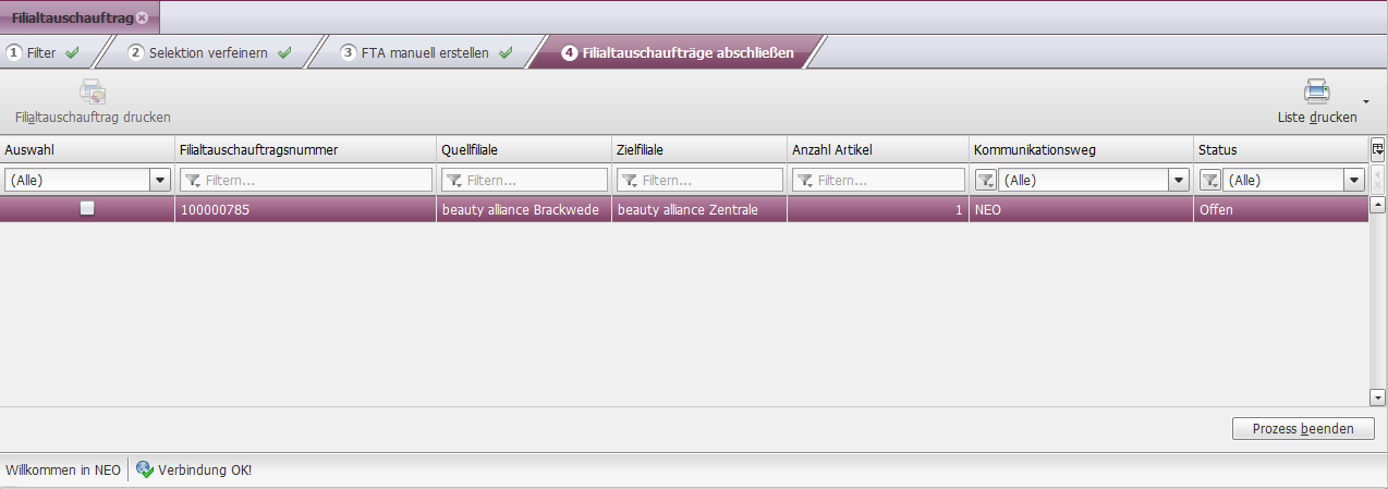 Über den Button Prozess beenden gelangen Sie in die Filialtauschauftragsübersicht.